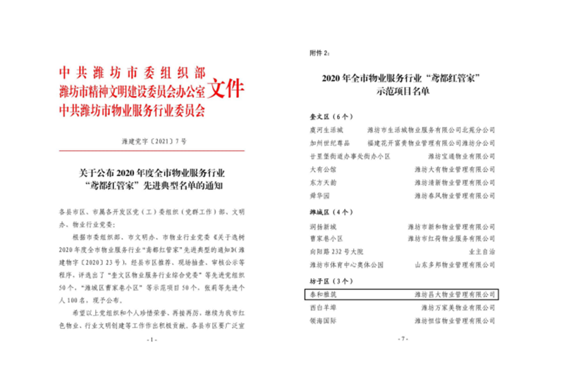 2021年1月29日,濰坊昌大物業(yè)管理有限公司負責的泰和雅筑項目,在市委組織部、市文明辦、市物業(yè)行業(yè)黨委公布的2020年度全市物業(yè)服務行業(yè)“鳶都紅管家”先進典型名單中,被評選為2020年度全市物業(yè)服務行業(yè)“鳶都紅管家”示范項目。
