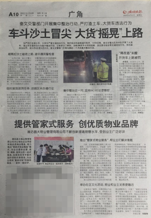 2019年10月11日,《濰坊晚報(bào)》在廣角版面(A10)的顯著位置以《提供管家式服務(wù) 創(chuàng)優(yōu)質(zhì)物業(yè)品牌》為題,報(bào)道了泰和旗下濰坊昌大物業(yè)管理有限公司通過不斷創(chuàng)新提高物管水平,為業(yè)主提供全面、周到、精致、差異化的一站式服務(wù),受到廣大業(yè)主的一致好評(píng)。