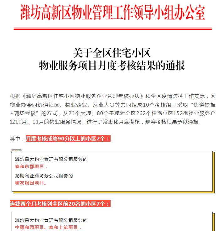 2022年12月21日,濰坊高新區(qū)物業(yè)管理工作領(lǐng)導(dǎo)小組發(fā)布《關(guān)于全區(qū)住宅小區(qū)物業(yè)服務(wù)項(xiàng)目月度考核結(jié)果的通報(bào)》,昌大物業(yè)服務(wù)的泰和東郡、中頤和園、泰和上筑項(xiàng)目在此次全區(qū)月度考核中表現(xiàn)突出、位列前茅,其中泰和東郡項(xiàng)目更是在全區(qū)262個(gè)住宅小區(qū)中連續(xù)兩個(gè)月獲評第一名。